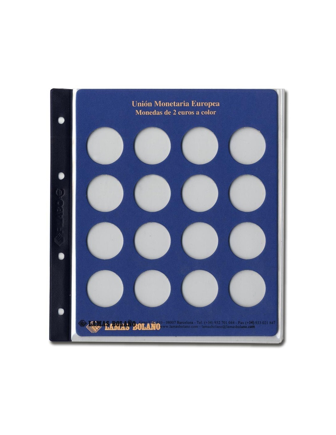 Hoja de cartón reforzado especial de 4 anillas en color azul de inserción fácil y segura con encaje perfecto. Con estampación en Oro inalterable. Capacidad para 16 monedas de 2€ con cápsula.