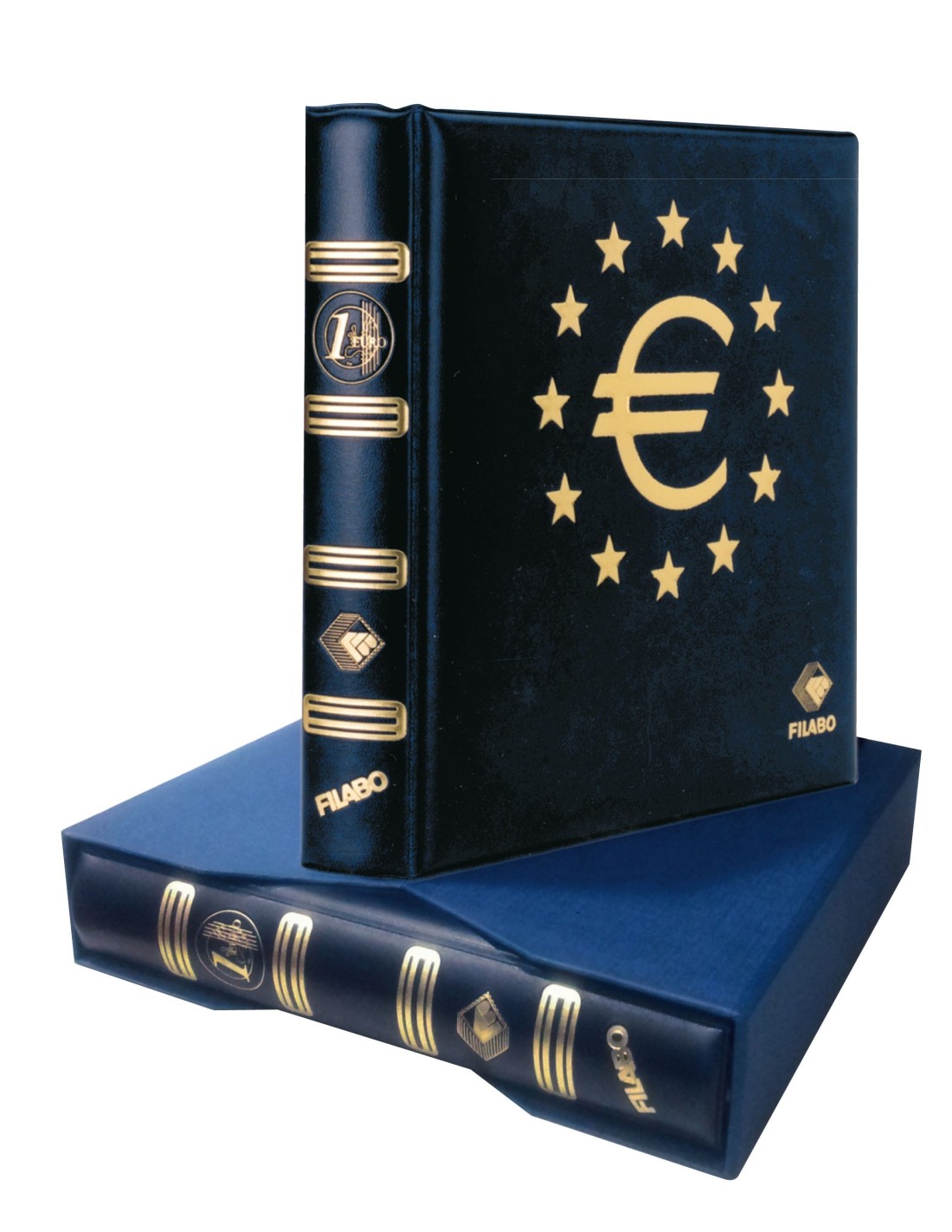 Álbum Euro Album Numis Billetes Euro skay azul con cajetín 4211002 34,00 € Fabricado en Skay acolchado de color azul y grabado con letras en oro inalterable con relieve. Sistema de 4 anillas con apertura automática. Tamaño standard unificado de 210x225mm. Añadir al carrito