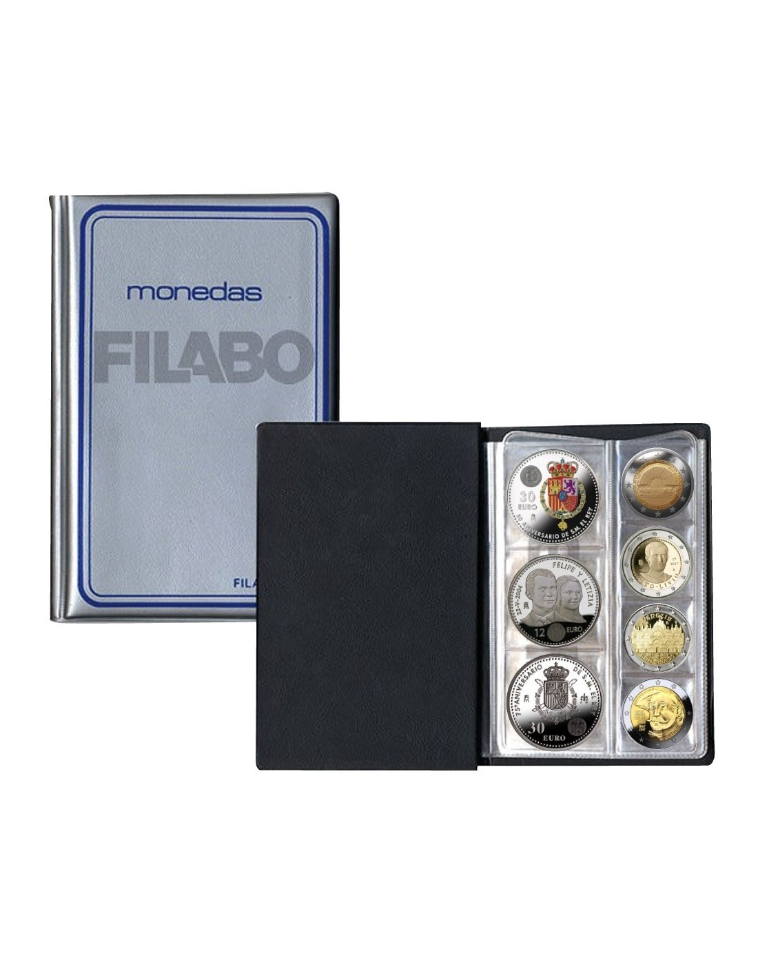ALBUM PARA MONEDAS FILABO 28. Tamaño bolsillo. Con diferentes colores en el contorno. En Skay acolchado y estampación serigrafiada. 4 Hojas con bolsa separador para añadir fichas, con alojamiento para 16 monedas de 34 x 34 mm. y 12 monedas de 45 x 45 mm. total 28 monedas. Hoja totalmente transparentes y muy resistentes. Ideal para transportar monedas.