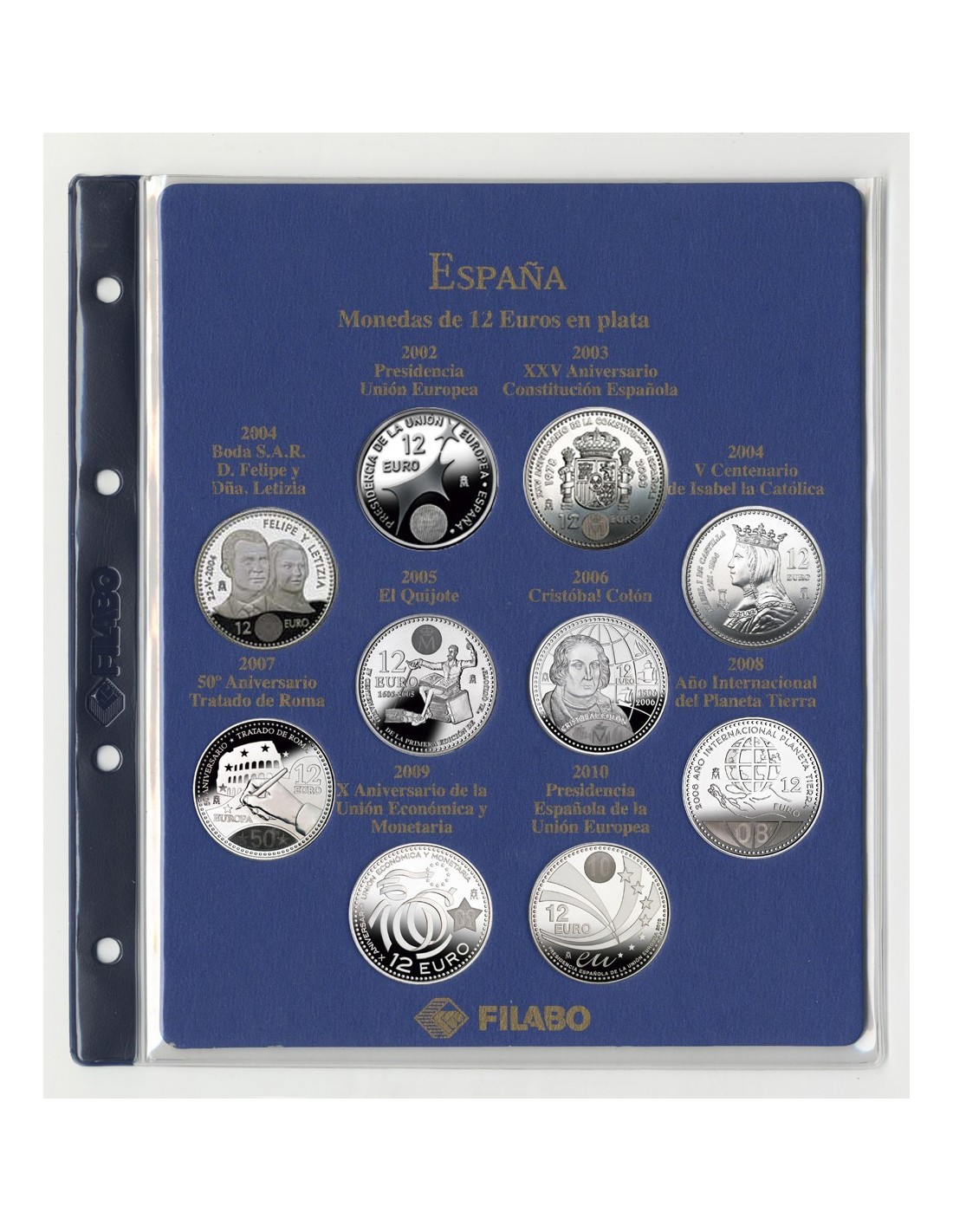 Hoja de cartón reforzado especial de 4 anillas en color azul de inserción fácil y segura con encaje perfecto para cada una de las monedas. Con estampación en Oro inalterable.