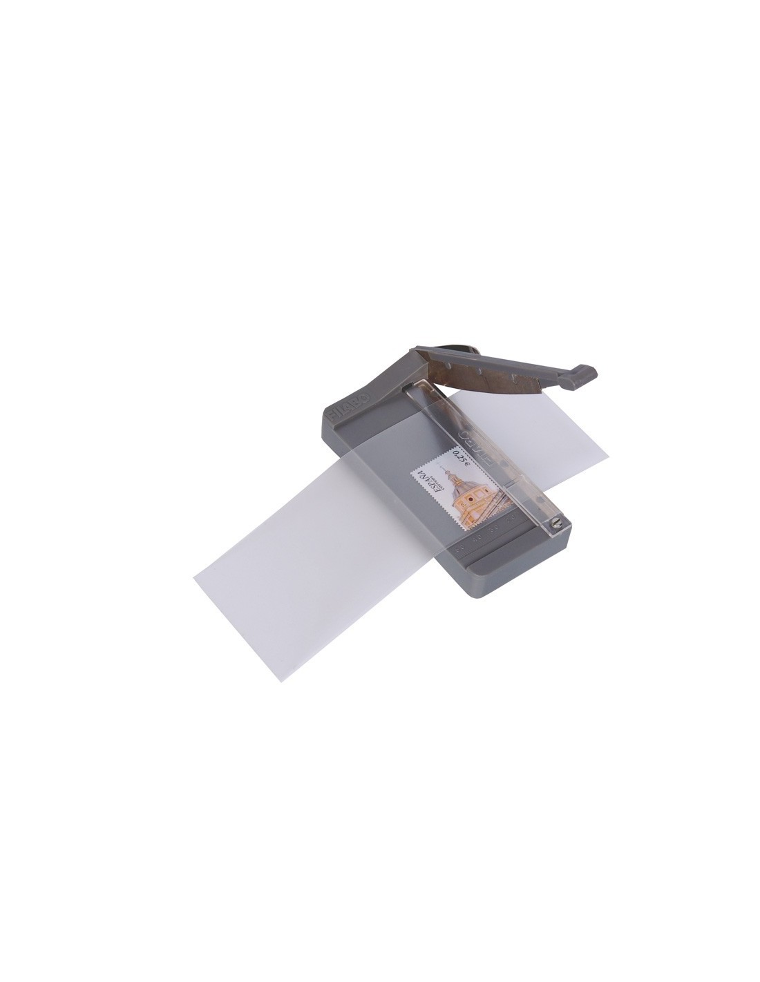 Guillotina especializada en corte de estuches protectores para sellos con guía corredera en milímetros para un ajuste más preciso.