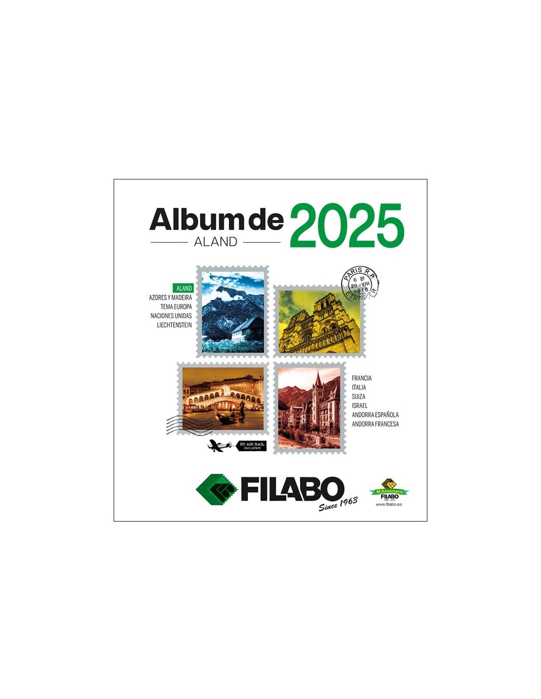 Las Hojas Filabo para colocar los Sellos y Hojitas Bloque de Aland de cada año. Con todos los sellos fotografiados a color desde 1996. Se incluyen datos técnicos de su interés. Existen dos tipos de acabado de Primera Calidad en un sistema de 15 perforaciones: Cartulina Blanca y Registro Crema. Las Hojas se puede adquirir con los estuches protectores ya incorporados en fondo transparente o negro, de fibra Polyestirol neutro que garantiza su perfecta conservación en el tiempo.