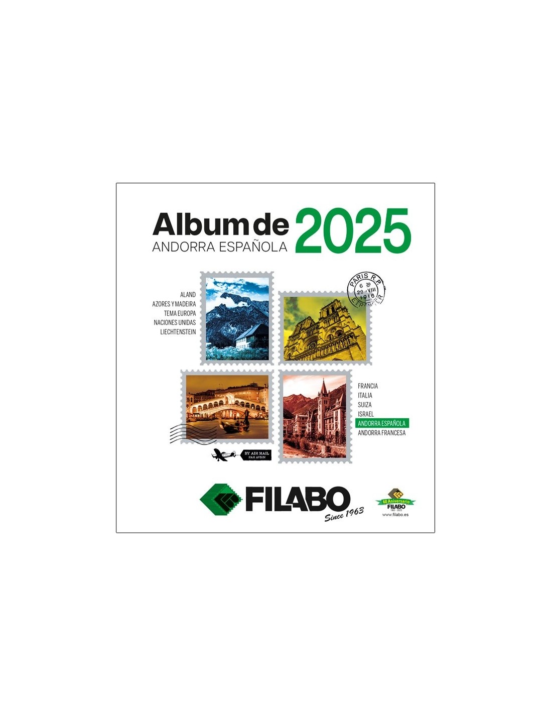 Las Hojas Filabo para colocar los Sellos y Hojitas Bloque de Andorra Española de cada año. Con todos los sellos fotografiados a color desde 1996. Se incluyen datos técnicos de su interés. Existen dos tipos de acabado de Primera Calidad en un sistema de 15 perforaciones: Cartulina Blanca y Registro Crema. Las Hojas se puede adquirir con los estuches protectores ya incorporados en fondo transparente o negro, de fibra Polyestirol neutro que garantiza su perfecta conservación en el tiempo.