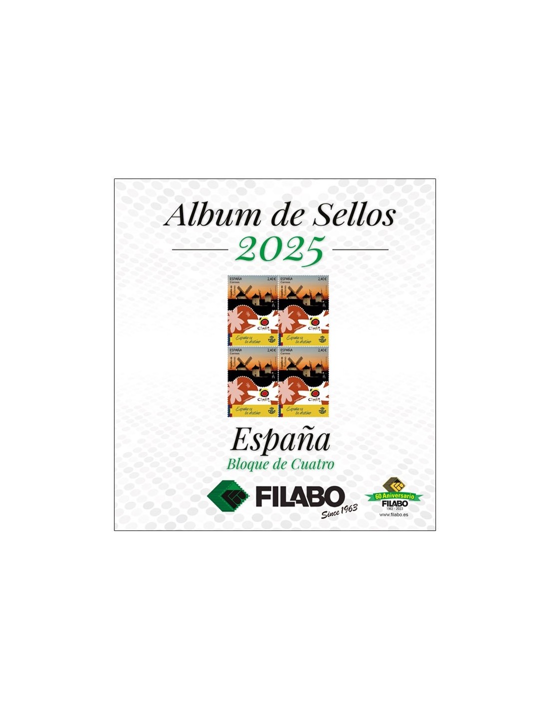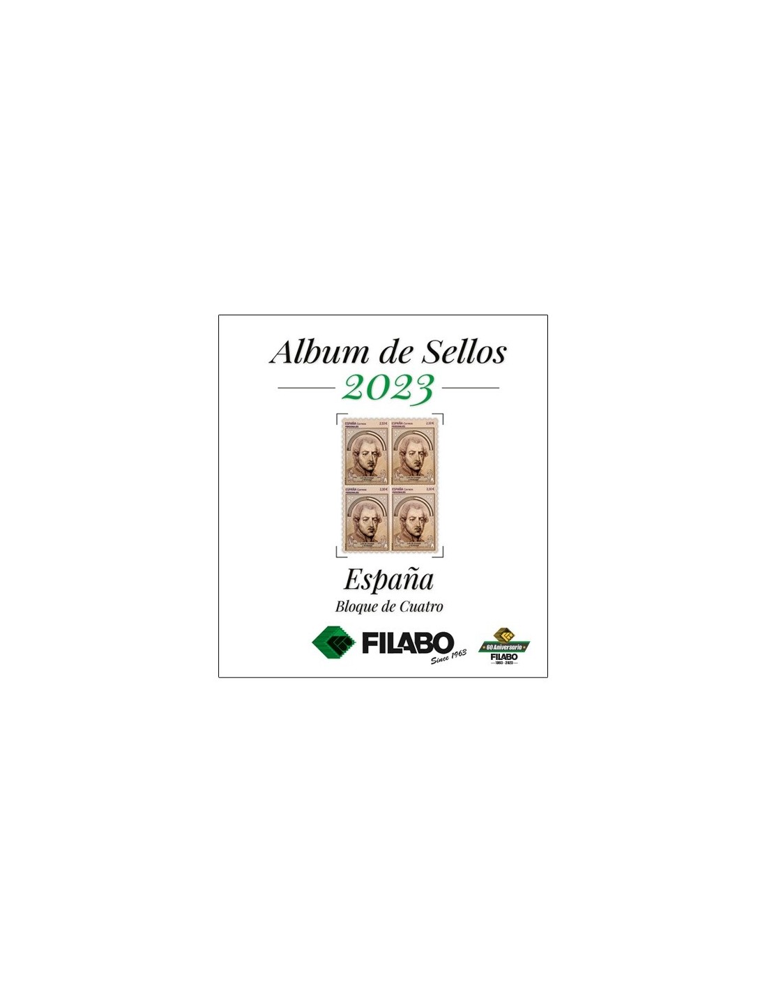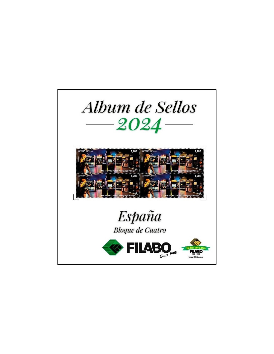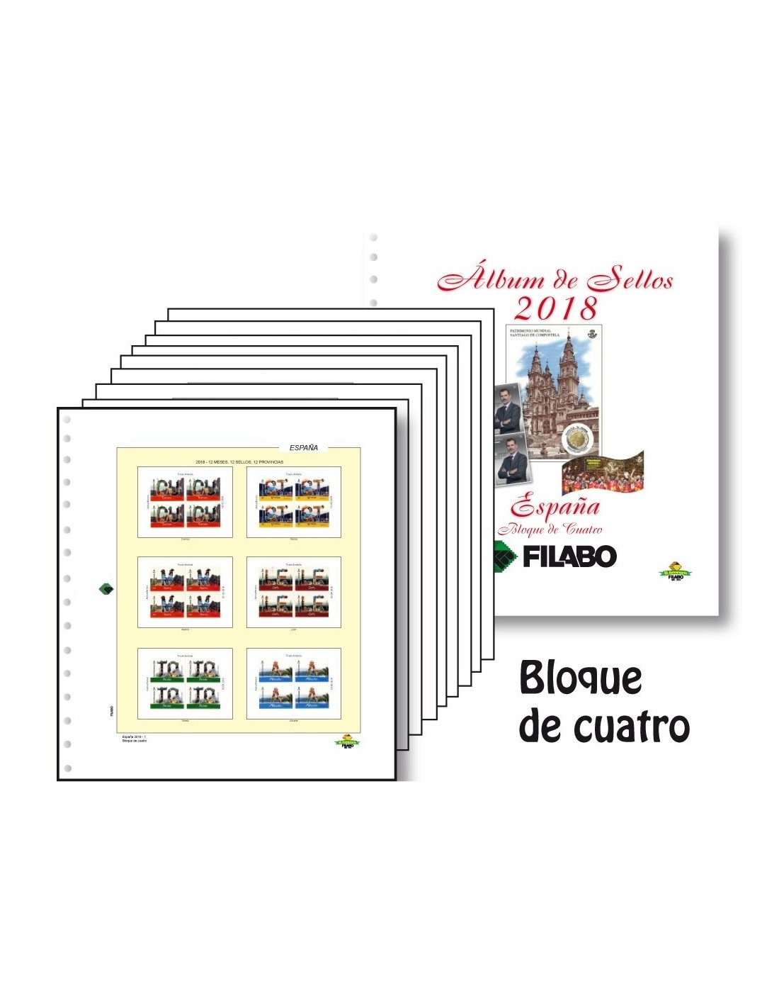 Las Hojas Filabo para colocar los Sellos y Hojitas Bloque en Bloque de Cuatro de cada año. Con todos los sellos fotografiados a color desde 1996. Se incluyen datos técnicos de su interés. Existen dos tipos de acabado de Primera Calidad en un sistema de 15 perforaciones: Cartulina Blanca y Registro Crema. Las Hojas se puede adquirir con los estuches protectores ya incorporados en fondo transparente o negro, de fibra Polyestirol neutro que garantiza su perfecta conservación en el tiempo.