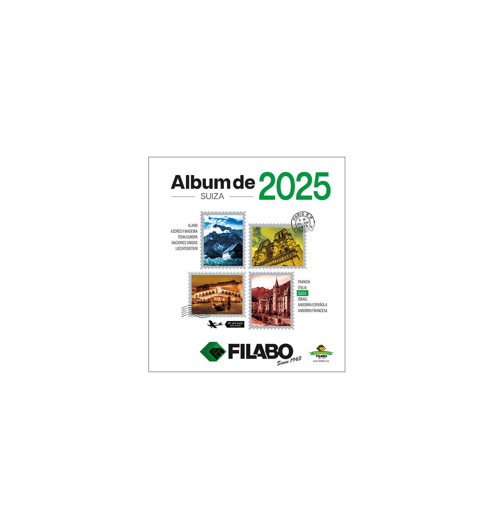 Las Hojas Filabo para colocar los Sellos y Hojitas Bloque de Suiza de cada año. Con todos los sellos fotografiados a color desde 1996. Se incluyen datos técnicos de su interés. Existen dos tipos de acabado de Primera Calidad en un sistema de 15 perforaciones: Cartulina Blanca y Registro Crema. Las Hojas se puede adquirir con los estuches protectores ya incorporados en fondo transparente o negro, de fibra Polyestirol neutro que garantiza su perfecta conservación en el tiempo.